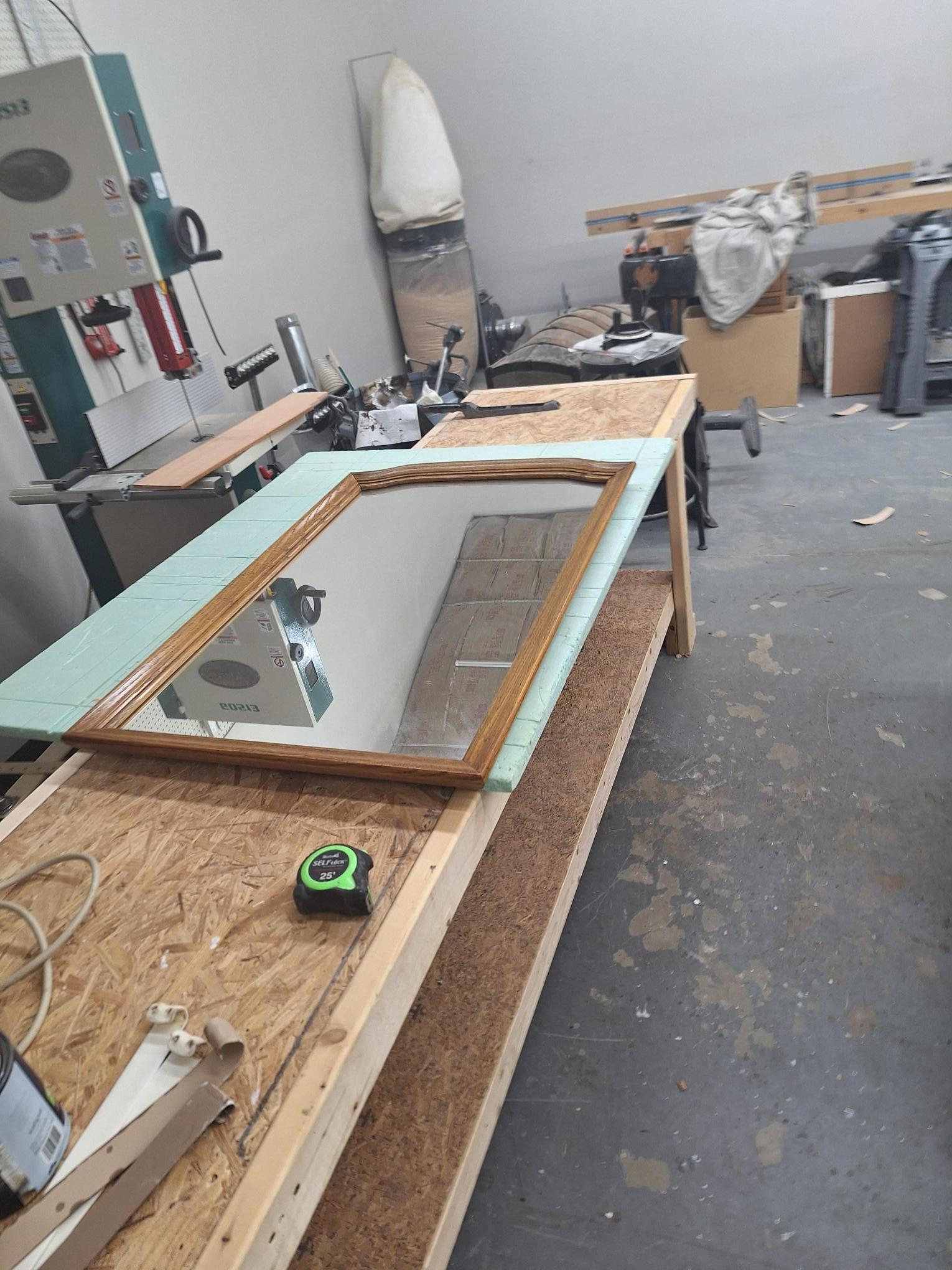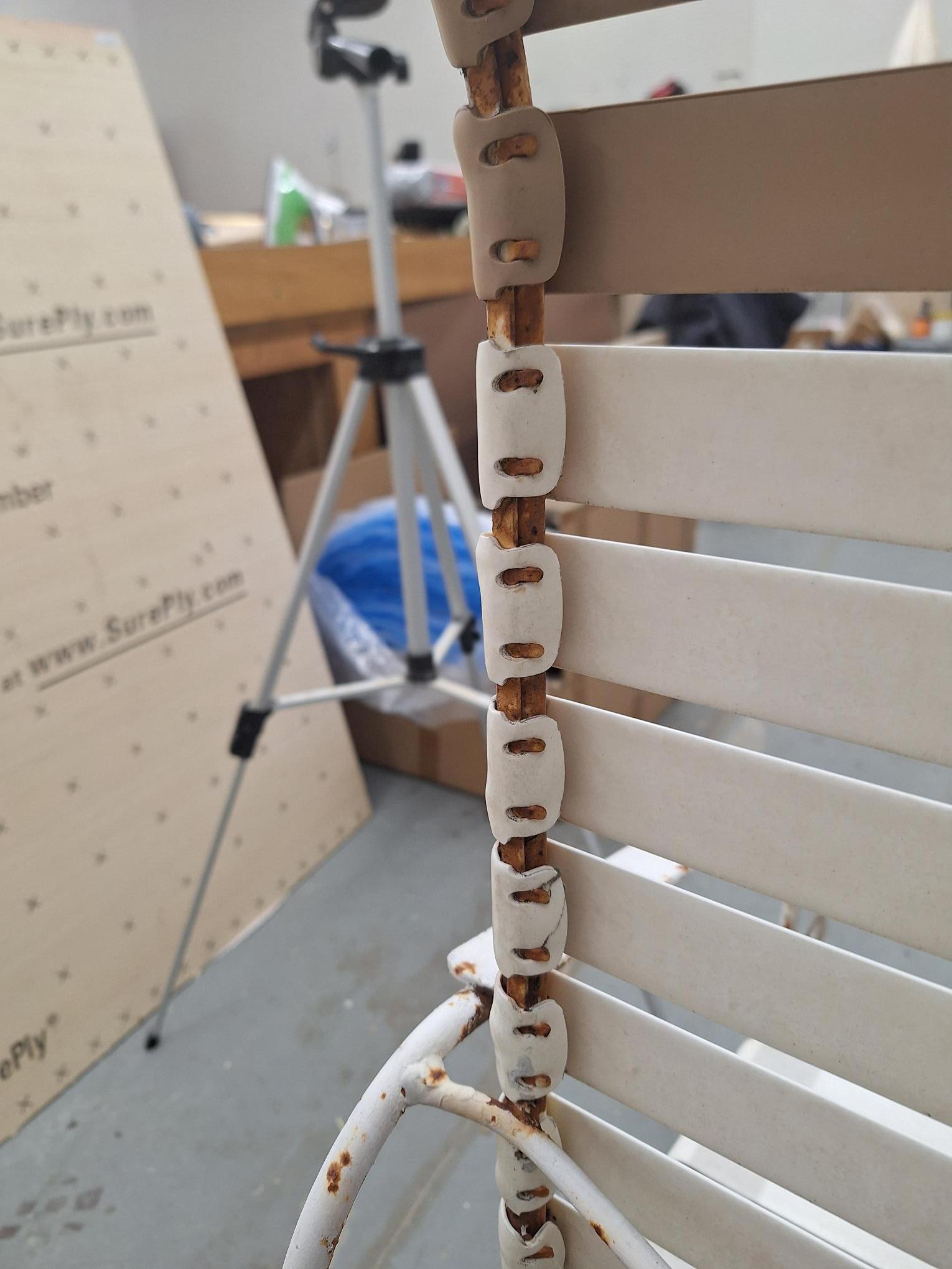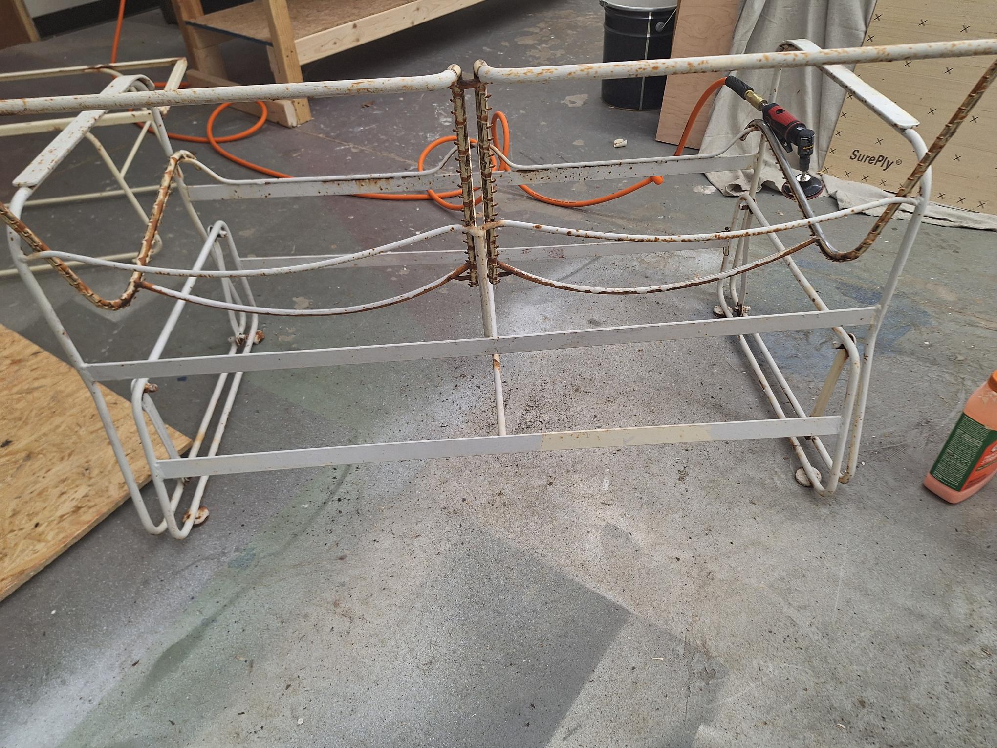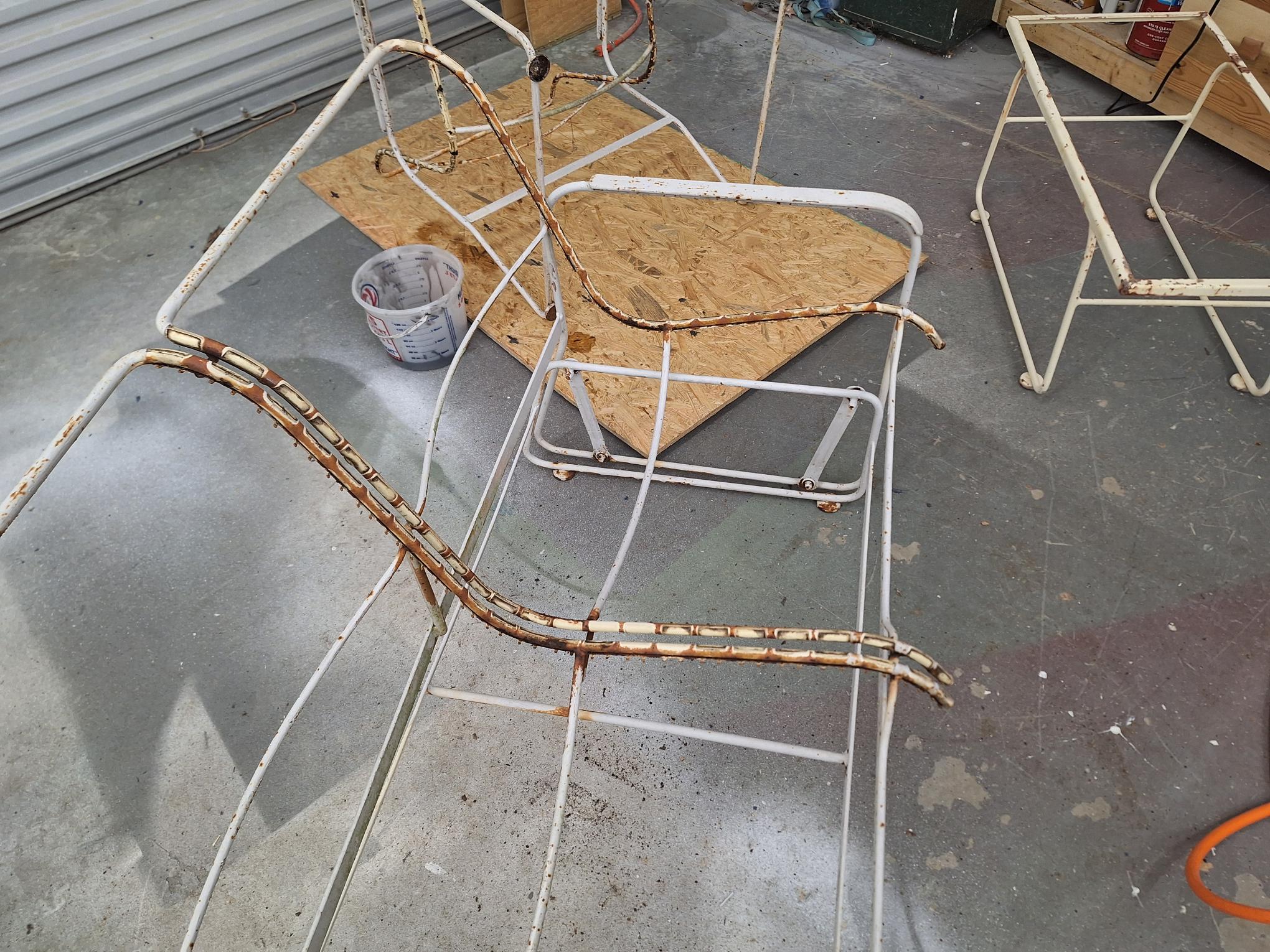 With the exception of the mirror this next job is not anything wood related. As you can see by the pictures, this is an old patio set this is in really rough shape. I tried every chemical I own to try and break down the paint and rust but nothing worked. After attempting to grind it off I realized that it would take me a month of Sundays. So I broke down and got me a Harbor Freight portable media blaster and as soon as this wind dies down later this week I will be attacking this thing. As you can see in the one picture that the vinyl is held in place by to prongs on each side of the strap. No one sells this style any more. So I am going to have to buy the strap material in rolls and cut and punch each strap individually. I will post the completed project once I finish it.