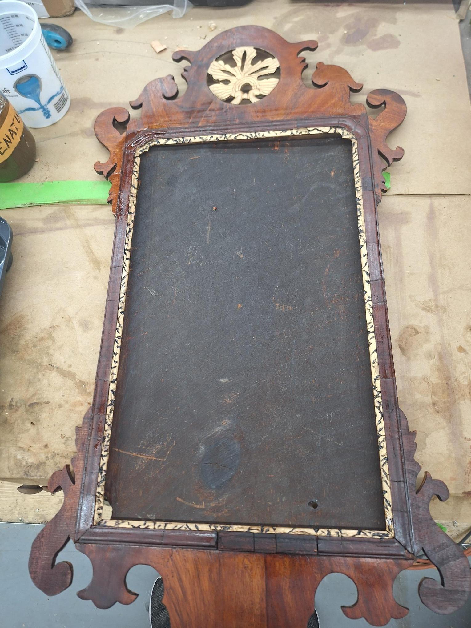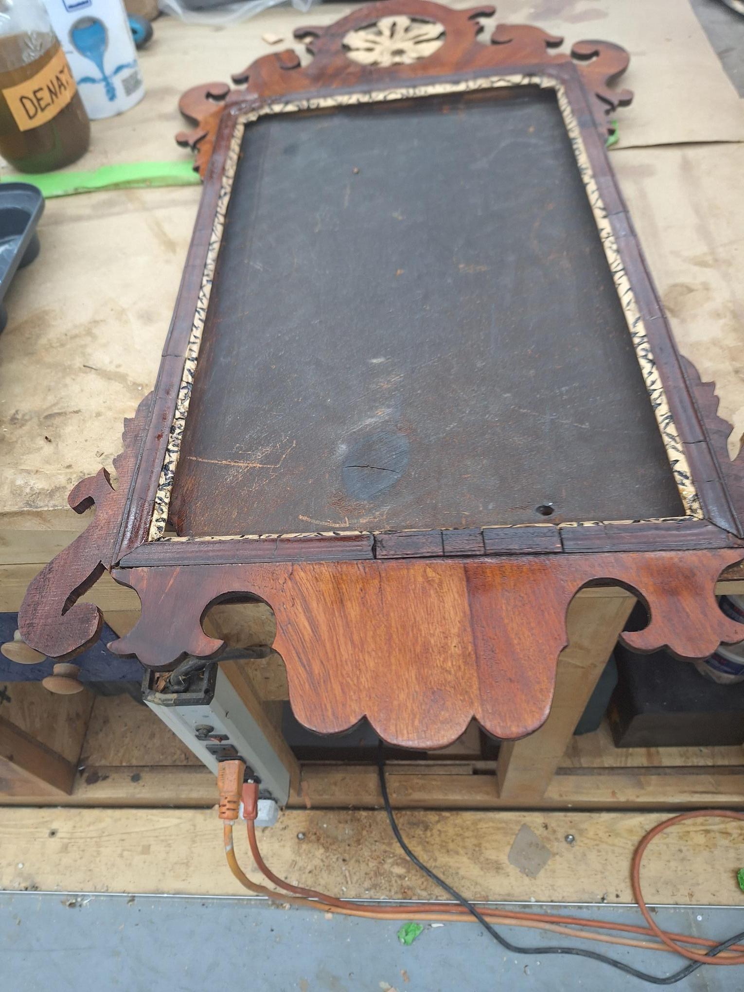 This is a framed mirror from 1909. Built by A. J. Antiques out of Danbury, CT. This company has since moved to PA.. It features an ornate carving on the top and is made of Mahogany with gold trim around the mirror